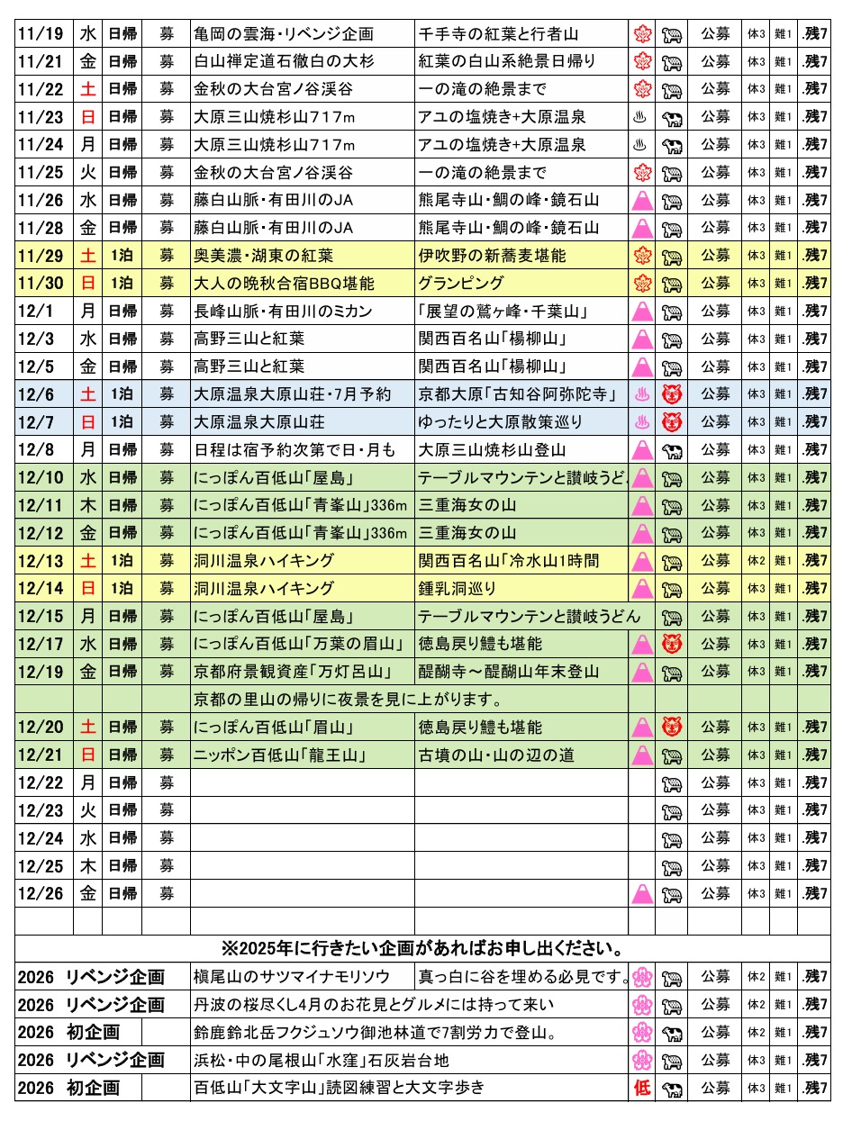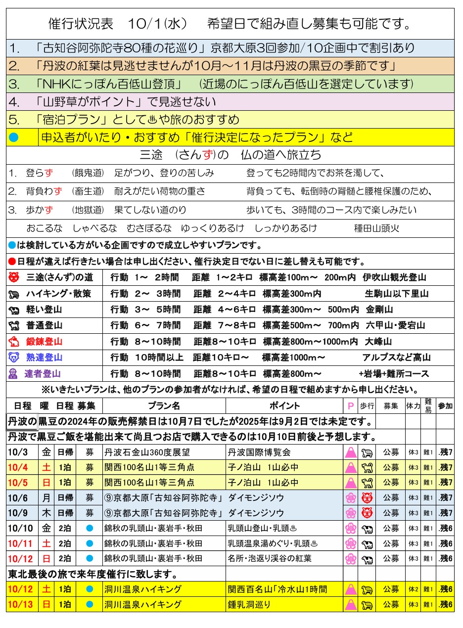 20250906 催行状況表 催行状況表の青字をクリックするとガイドプランになるように9/6現在、工事をしています。